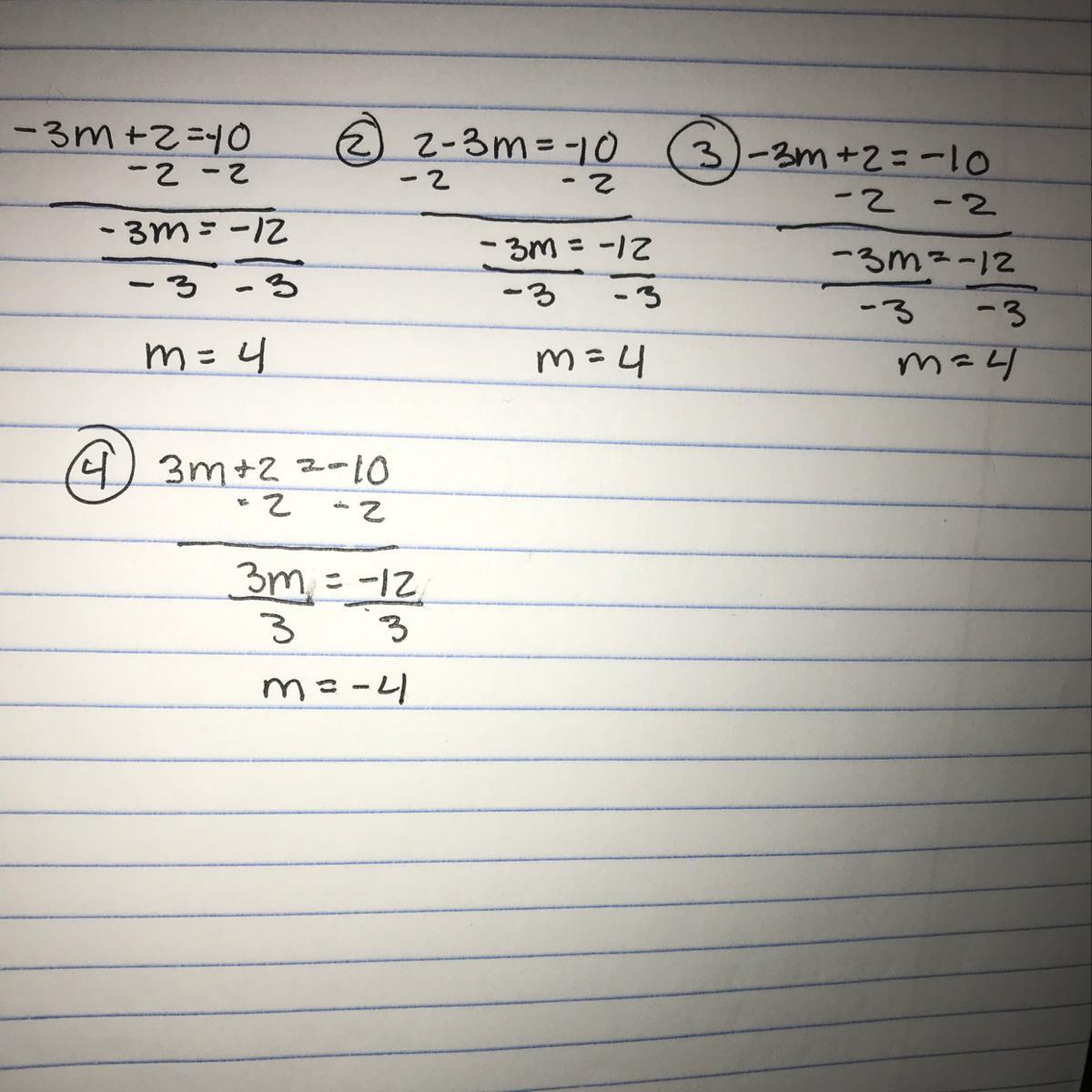 This is if you need it written out, but the answer would be the last one 3m+2=-10 doesn’t have the same solution as the rest