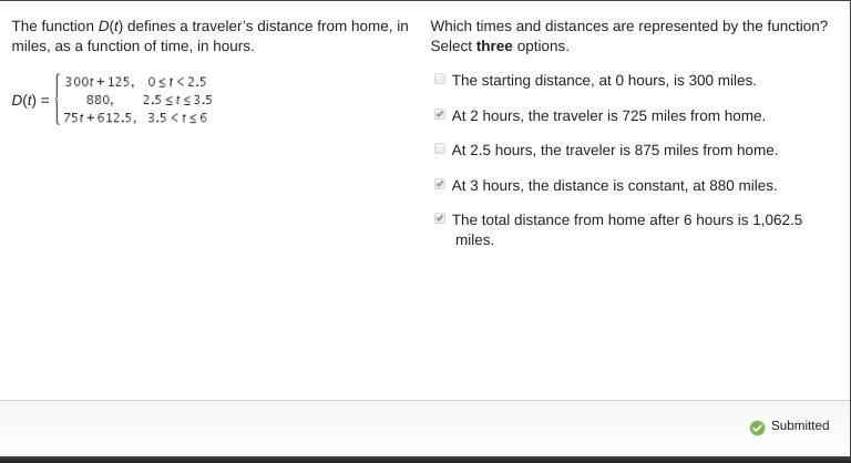 D(2) = 300(2) + 125 = 725 miles (at t lies in the range of 0 and 2.5) <--