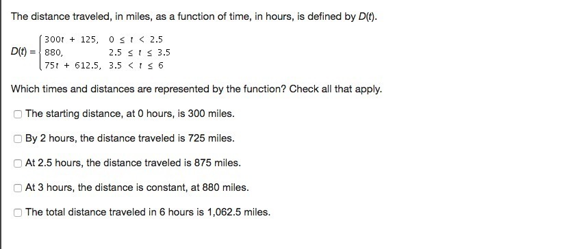 D(6) = 75(6) + 612.5 = </span>1,062.5 miles (since t is in the range of 3.5 and 6) <--
