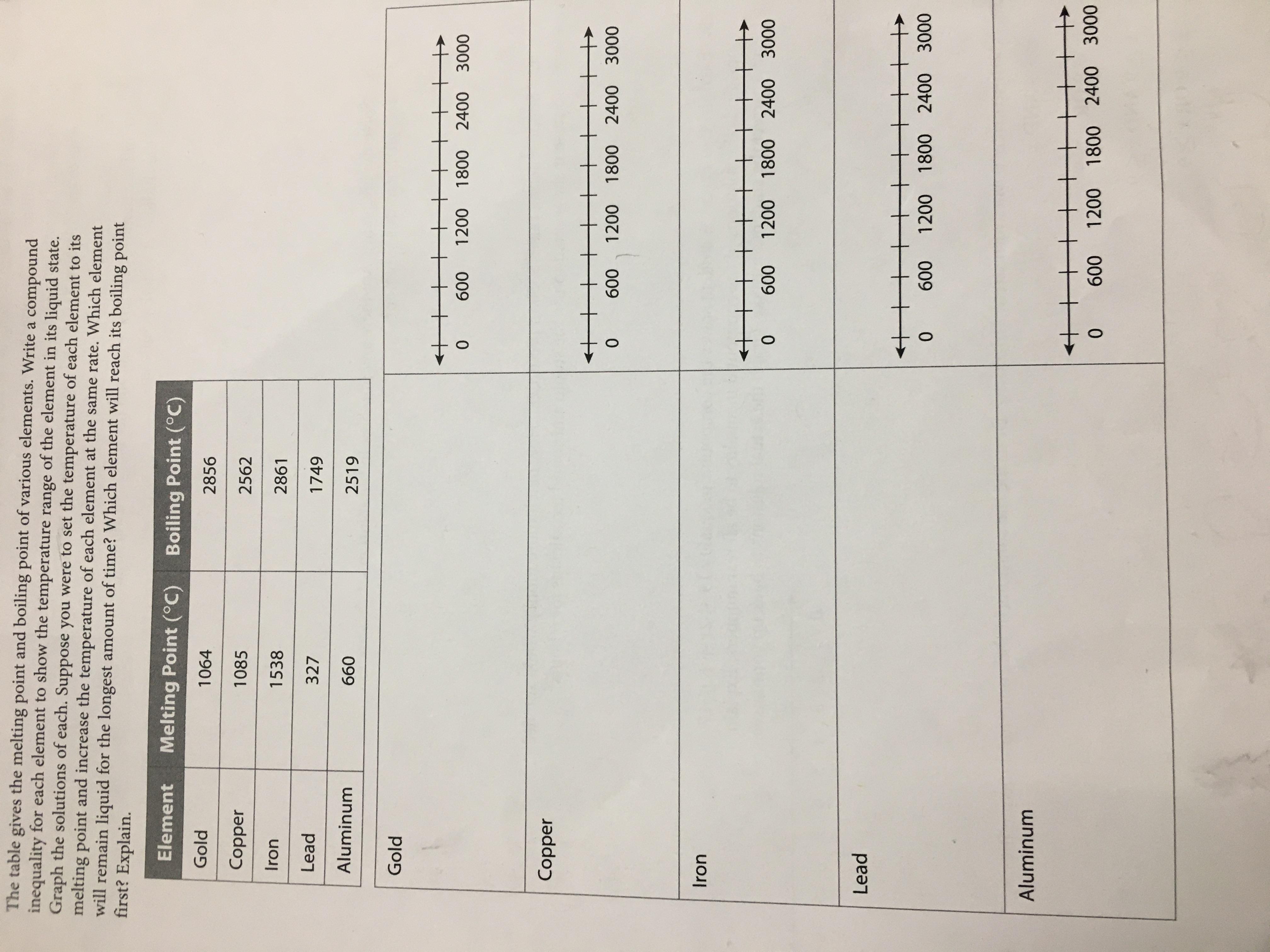 ment to show the temperature range of the element in its liquid state. Graph the solutions of each. Suppose you were to set the temperature of each element to its melting point and increase the temperature of each element at the same rate. Which element will remain liquid for the longest amount of time? Which element will reach its boiling point first? Explain.