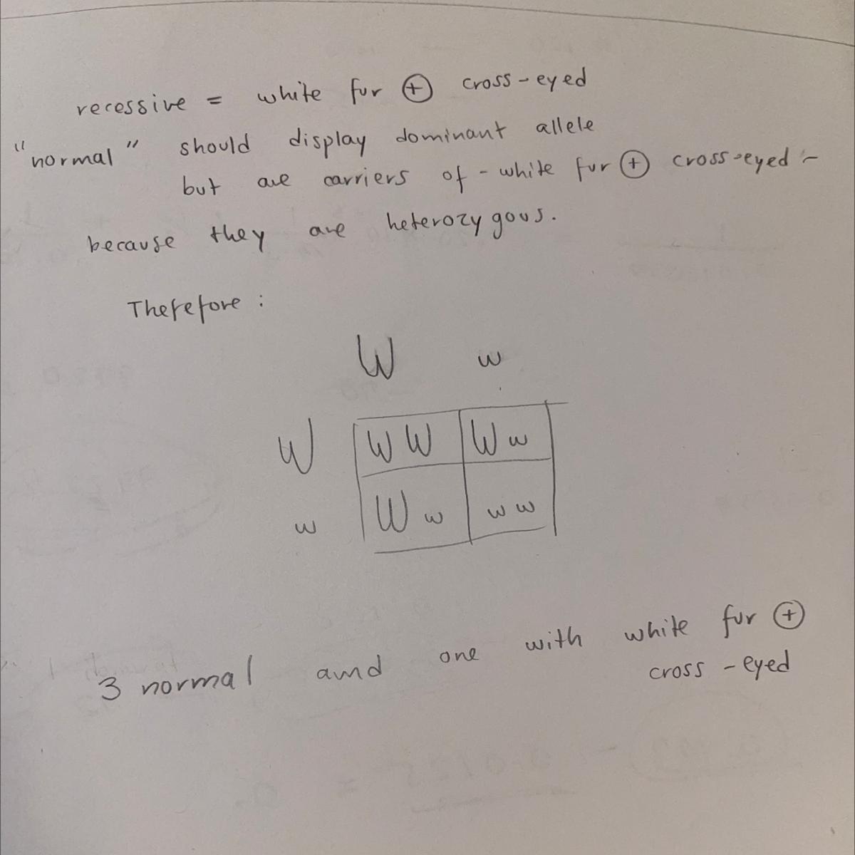 The answer will be 3 normal and 1 with white fur + cross-eyed.
