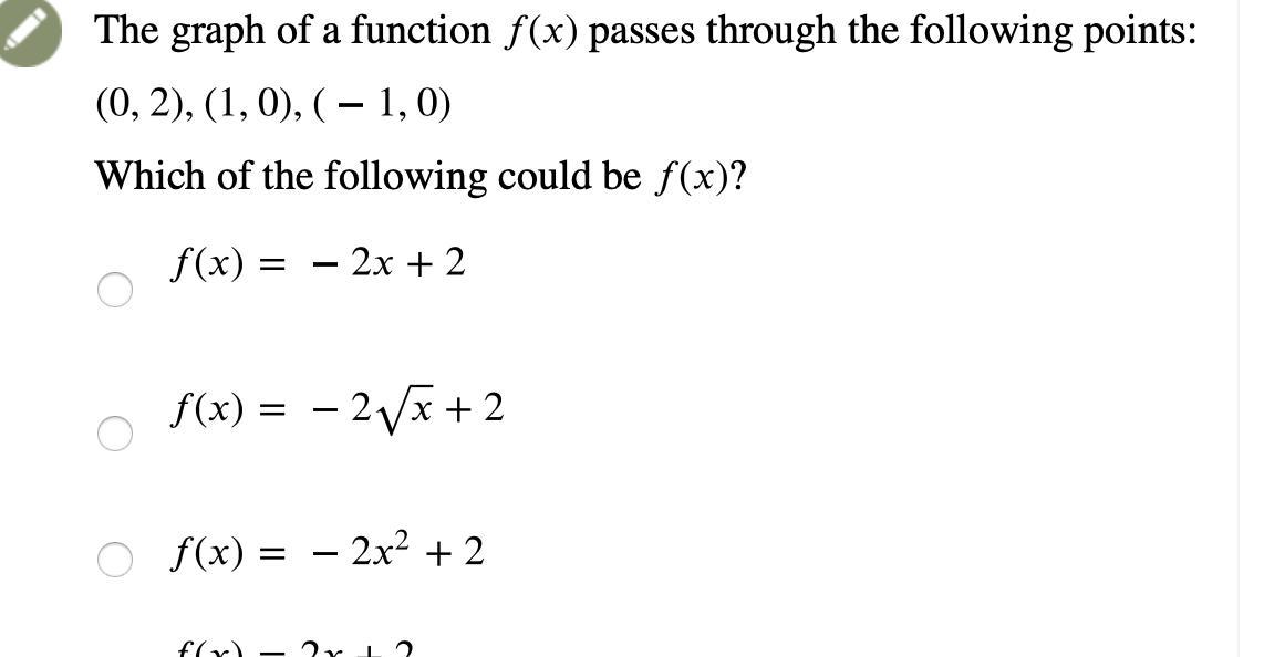 The vertex of this graph would be at (0, 2), so your degree coefficient would be negative. Your y-intercept would also be at (0, 2). Since both 1 and -1 are included, you can tell it is a parabola, and hence the 3rd option is your answer.