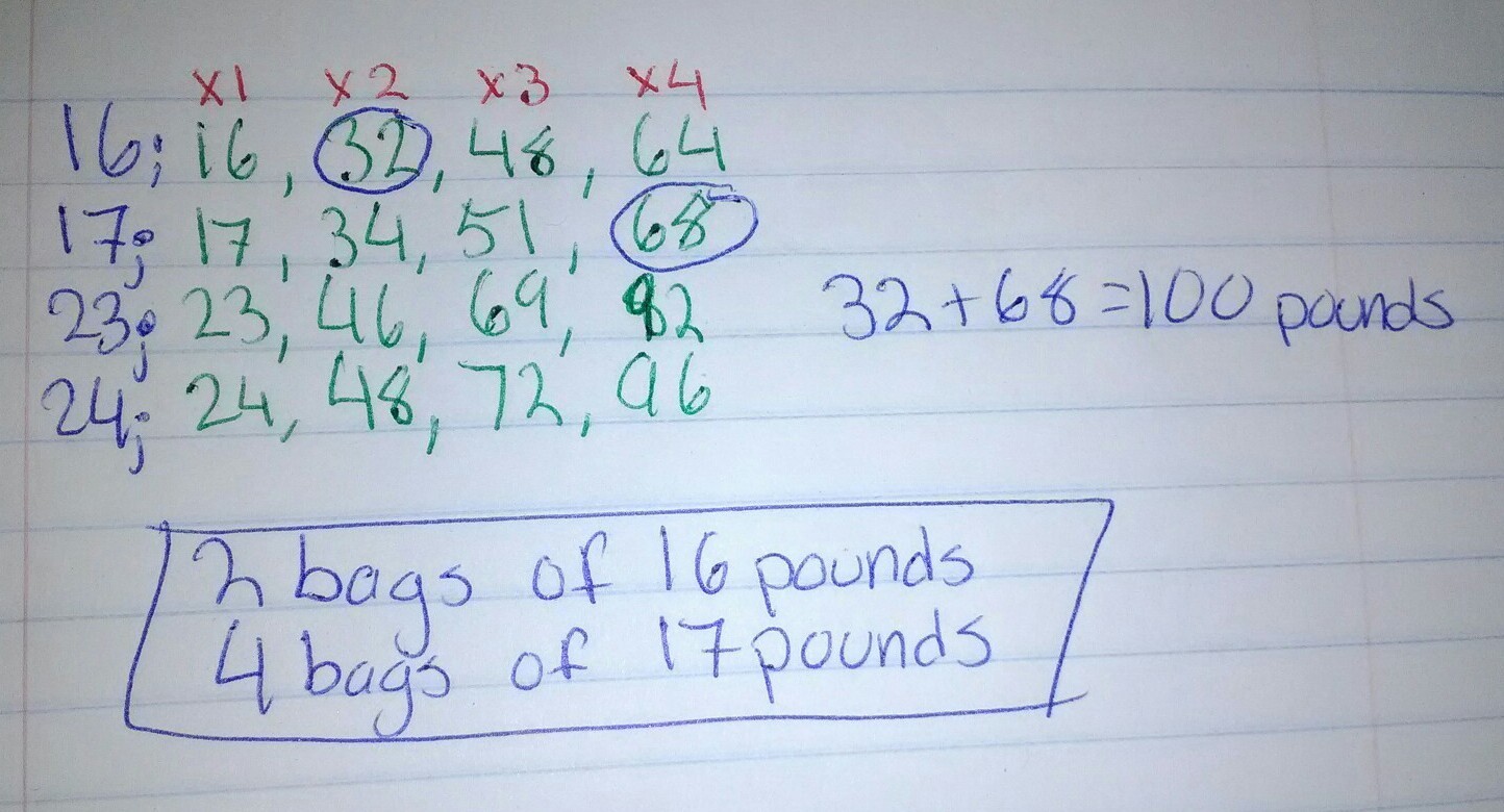 2x16=32. 4x17=68. 32+68=100. so 2 boxes kf the 16 pounds and 4 boxes of the 17 pounds makes an even 100 pounds