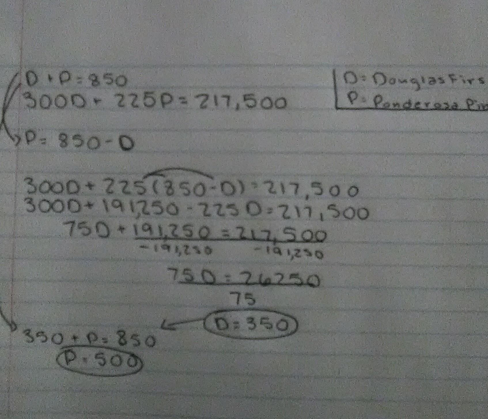 Hence, Douglas fir trees are 350 in number and Ponderosa pine trees are 500 in number.