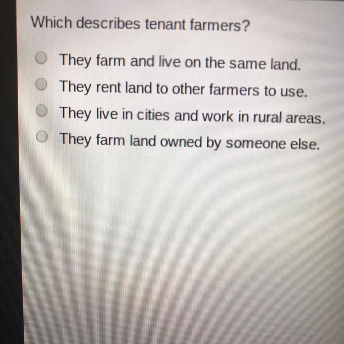 Tenant farmers live on are rented land and farm it. They are allowed to keep some of the profits/crops but pay a portion of it to the landowner to pay them back. This method got fairly popular after slavery as it allowed land to still be worked and the landowner still kept the majority of the profit