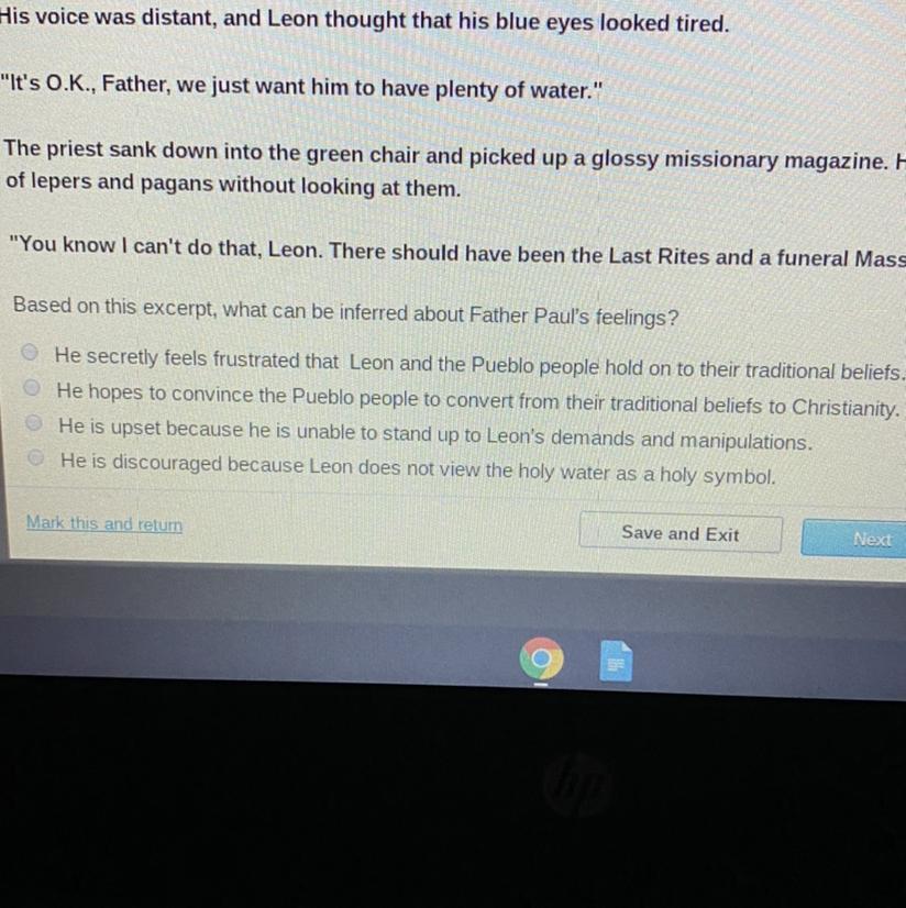<em>Hello There the correct answer is D He is discouraged because Leon does not view the holy water as a holy symbol.</em>