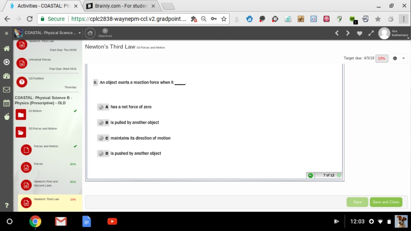 laws of motion relate an object’s motion to the forces acting on it. In the first law, an object will not change its motion unless a force acts on it. In the second law, the force on an object is equal to its mass times its acceleration. In the third law, when two objects interact, they apply forces to each other of equal magnitude and opposite direction.