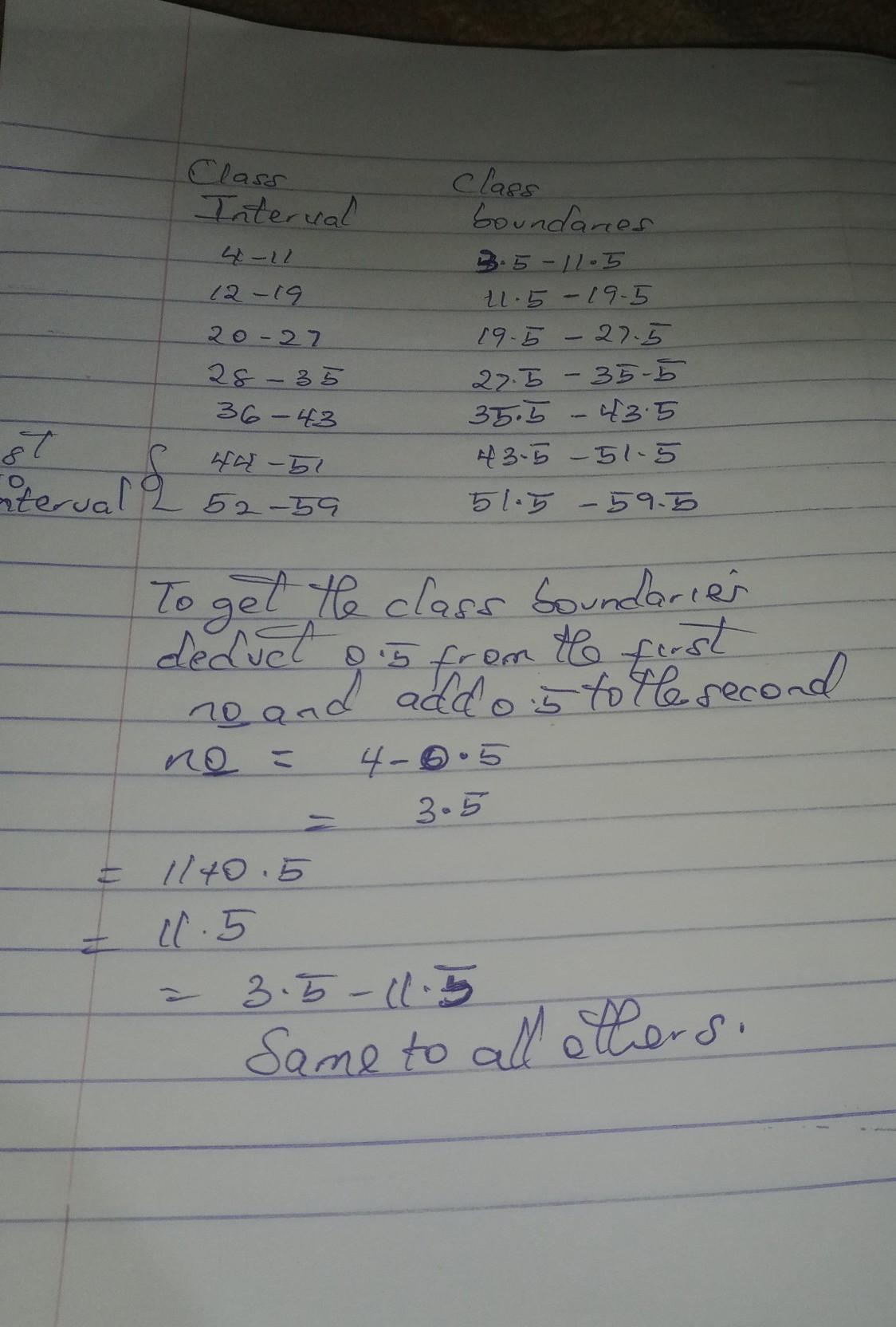 <h2>To get the class boundaries deduct 0.5 from the first number and add 0.5 to the second number = 4-0.5 = 3.5 </h2><h2> = 11.5 + 0.5 = 11.5 </h2><h2> = 3.5 -11.5 as in the fish class boundary .</h2><h2>same for all other boundaries</h2>