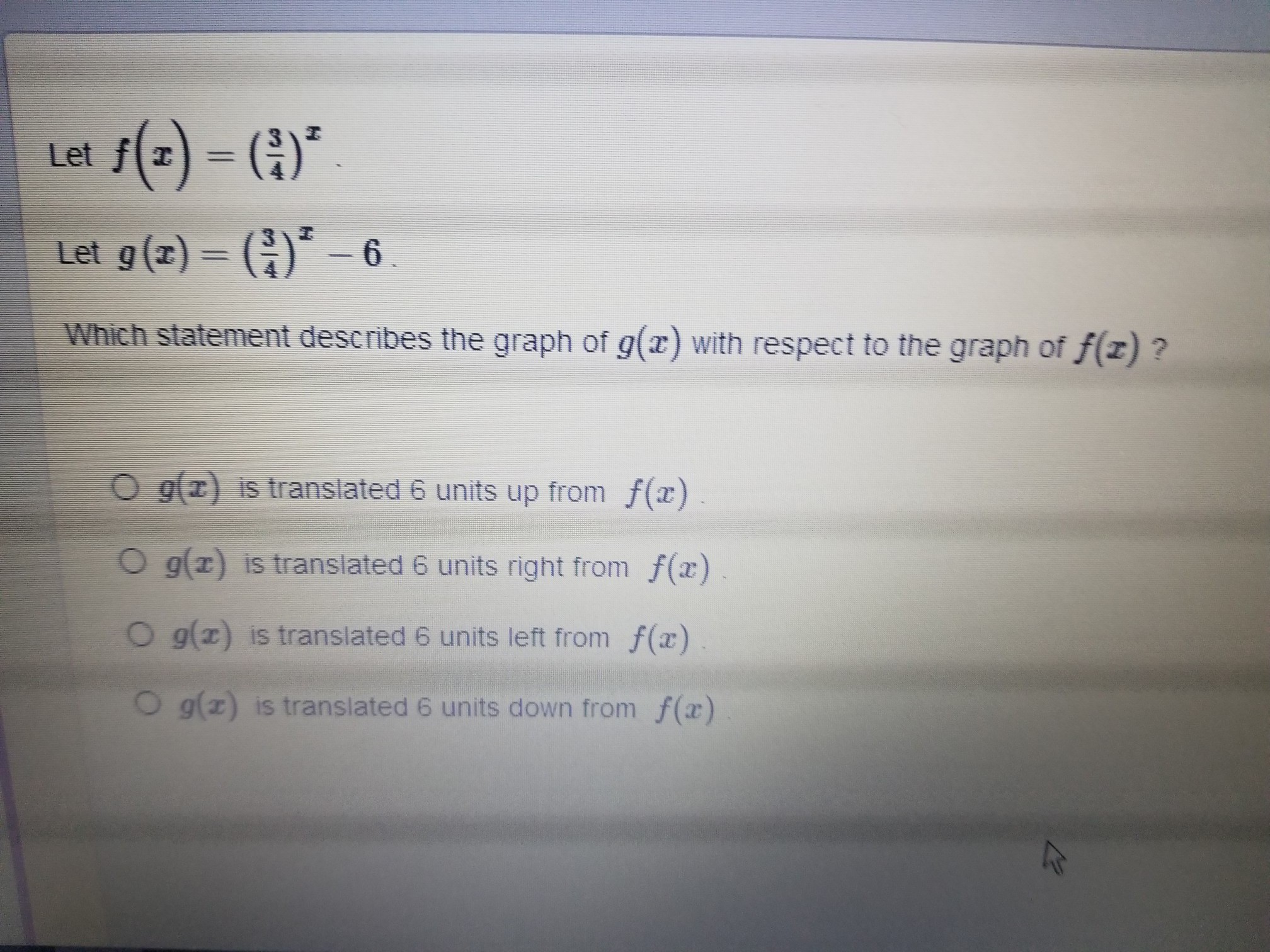 This graph has the output outside of x subtracted by 6. It will shift 6 units down.