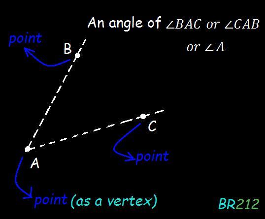 We denote an angle with three points and a symbol ∠. The middle point is always the vertex. We can also give angle names only with vertices. For example, based on the attached image, the angle can be denoted as ∠BAC, or ∠CAB, or ∠A.