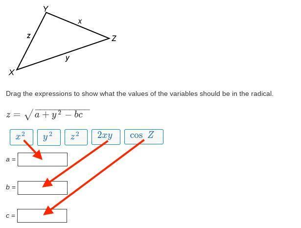 The last term (bc) must match 2xy·cos(Z). Since one of the tiles is cos(z), assigning that to "c" will leave "b" = 2xy, another tile. Hence the solution shown below. (Note that values of "b" and "c" could be swapped and the equation would still be correct, even if the form doesn't quite match.)