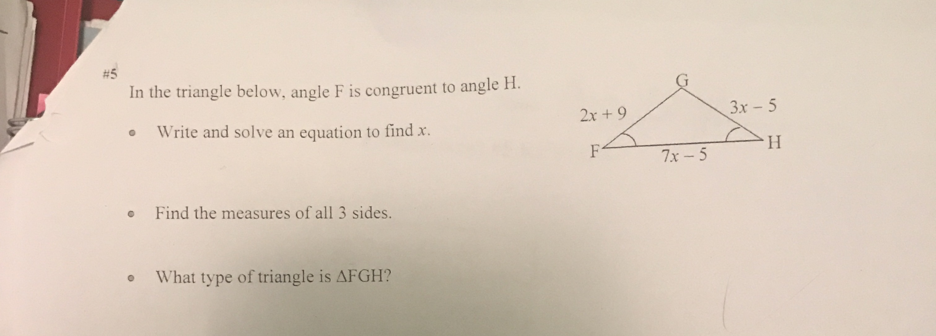 In geometry, if 2 angles are congruent, then their corresponding sides are also congruent. So you can have 3x-5=2x+9 & solve for x. Then substitute that value into all the other expressions to get the measures of all 3 sides. From there, you can determine the type of triangle