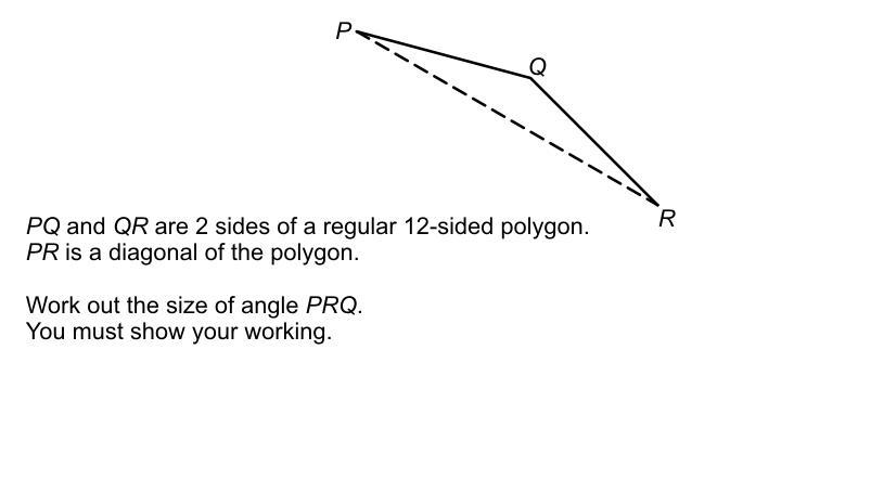 Therefore in the question, ∠PQR = 150° (angle of a 12 sided polygon), ∠PRQ = ∠QPR = x