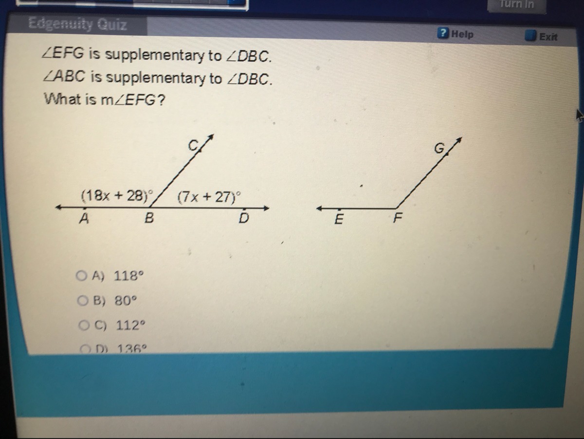 Angles EFG and ABC are supplementary to DBC, which means that EFG and ABC are the same angle.