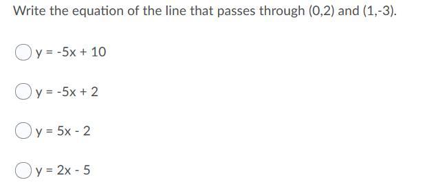 Write the equation of the line that passes through (0,2) and (1,-3).