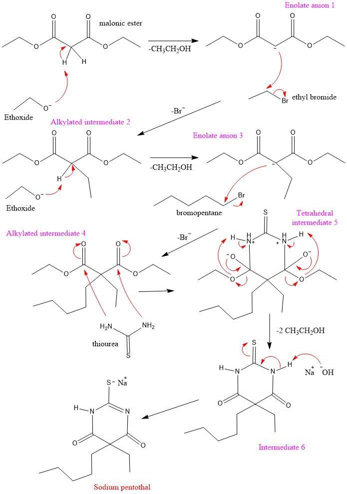 7. Intermediate 6 reacts with sodium hydroxide to form sodium pentothal.