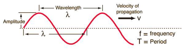 The velocity of light, v, is the product of its wavelength, λ , and its frequency, f.