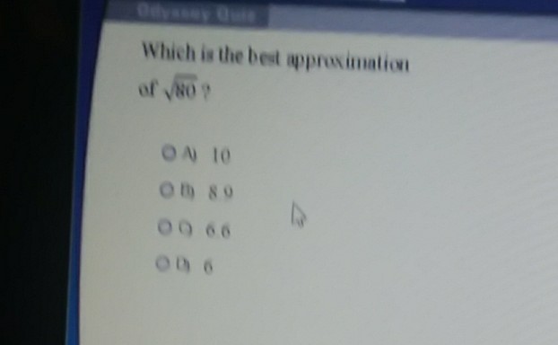 Normally, you would just use a calculator and enter √80. But if you don't want to use a calculator, remember that the square root is the number that goes into something when multiplied by itself. For example, √9 is 3, because 3*3=9. So, 80 is very close to 81. √81=9. Therefore, the answer to √80 will be slightly smaller than and extremely close to 9. Therefore, the answer is B) 8.9