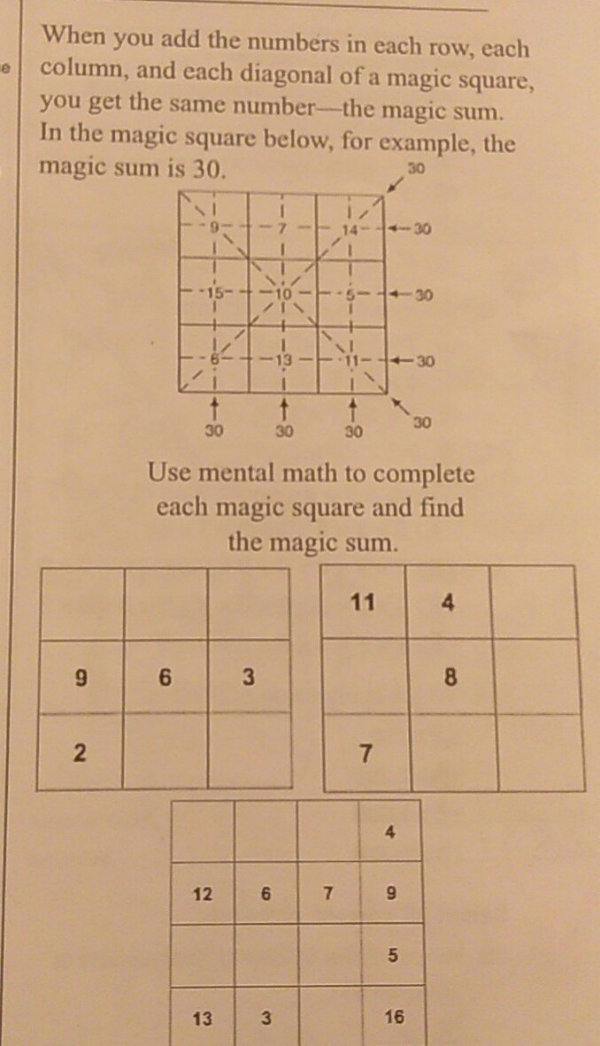 The middle row has 9+6+3 = 18 as the magic constant (aka magic sum). Every row, column and diagonal must add to this constant