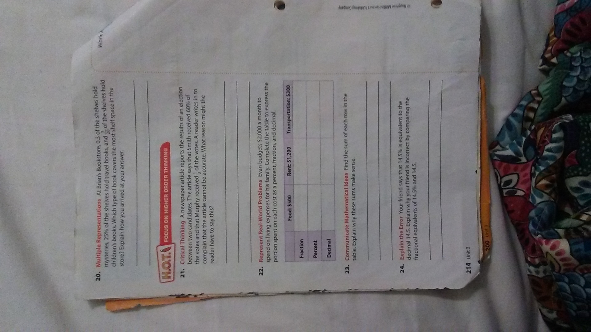 22. Food : 500/2000 reduces to 1/4......or 25%......or 0.25 Rent : 1200/2000 reduces to 3/5....or 60% ...or 0.6 Transportation : 300/2000 reduces to 3/20...or 15%..or 0.15