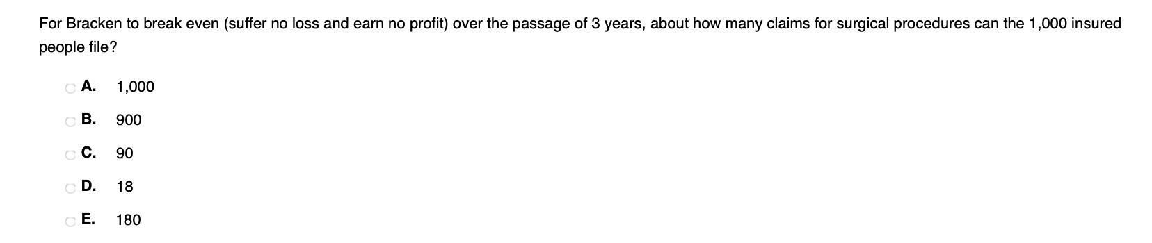 18,000,000/20,000 = 900 amount of surgical procedures the 1,000 insured people can claim for him to break even