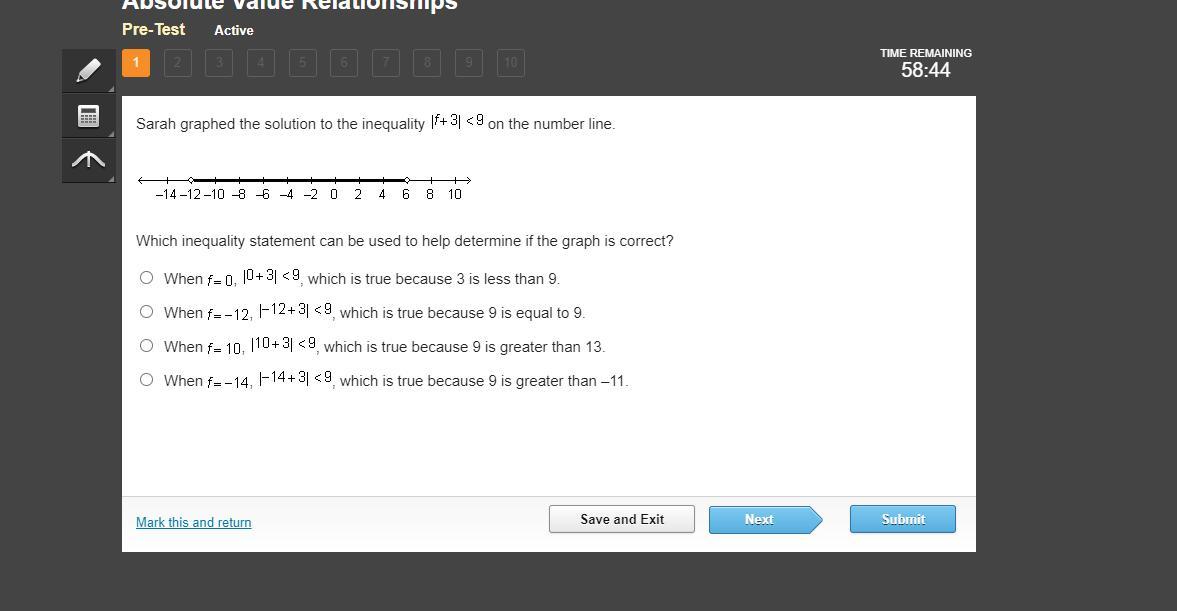 When f = 10, |10 + 3| < 9, which is true because 9 is greater than 13.