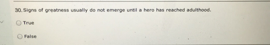 30. Signs of greatness usually do not emerge until a hero has reached adulthood.O TrueO False