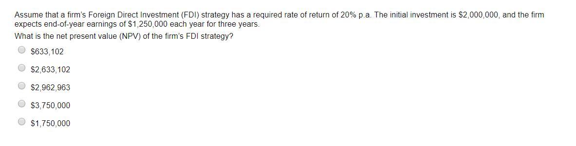 Assume that a firm's Foreign Direct Investment (FDI) strategy has a required rate of return of 20% p.a. The initial investment i