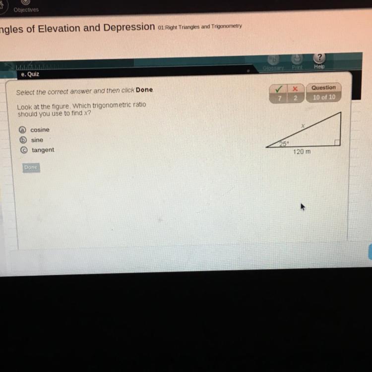 From the figure given, adjacent is given to be 120 m and hypotenuse is what we are to find, the best trigonometric ratio that can be use to find x with the value given is cos