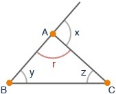 Which relationship is always true for the angles r, x, y, and z of triangle ABC?