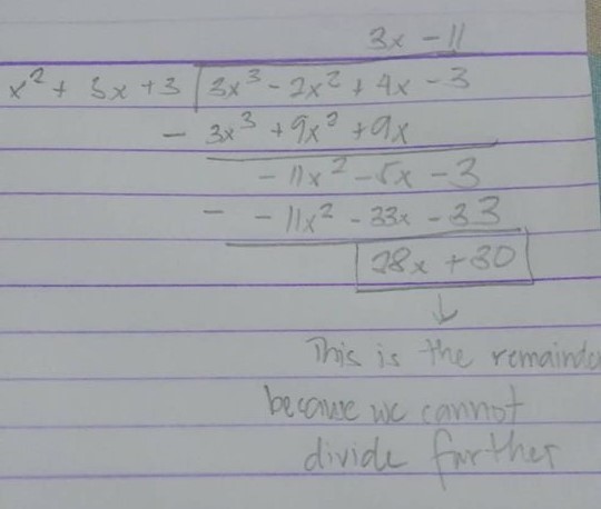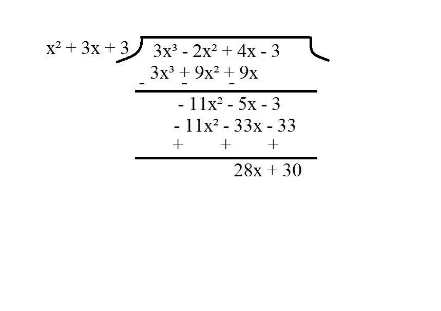 The final quotient will then be 3x - 11 remainder 28x + 30