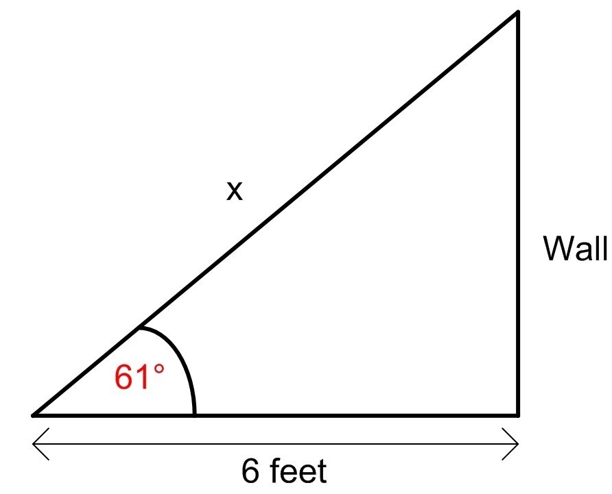 angle of elevation of 61°. The bottom of the ladder is 6 ft from the base of the wall. How long is the ladder? Round your answer to the nearest foot. Do not include units.