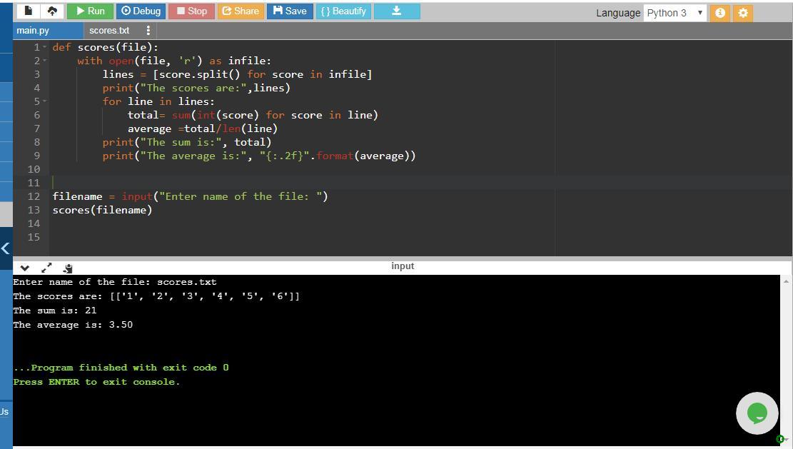 def scores(file): # method scores that takes a file name as parameter and returns the sum and average of scores in a file