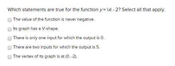 Its graph has a V-shape. This is true because it is the graph of y=|x| shifted downwards by 2 units.