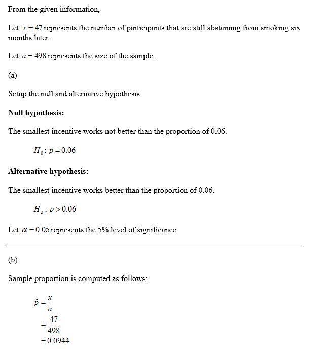 entives, the proportion of smokers trying to quit who are still abstaining six months later is about 0.06. Participants in the study were randomly assigned to one of four different incentives, and the proportion successful was measured six months later. Of the 498 participants in the group with the least success, 47 were still abstaining from smoking six months later. We wish to test to see if this provides evidence that even the smallest incentive works better than the proportion of 0.06 with no incentive at all. State the null and alternative hypotheses, and give the notation and value of the sample statistic. Use a randomization distribution and the observed sample statistic to find the p-value. Give the mean and standard error of the normal distribution that most closely matches the randomization distribution, and then use this normal distribution with the observed sample statistic to find the p-value. Use the standard error found from the randomization distribution in part (b) to find the standardized test statistic, and then use that test statistic to find the p-value using a standard normal distribution. Compare the p-values from parts (b), (c), and (d). Use any of these p-values to give the conclusion of the test.