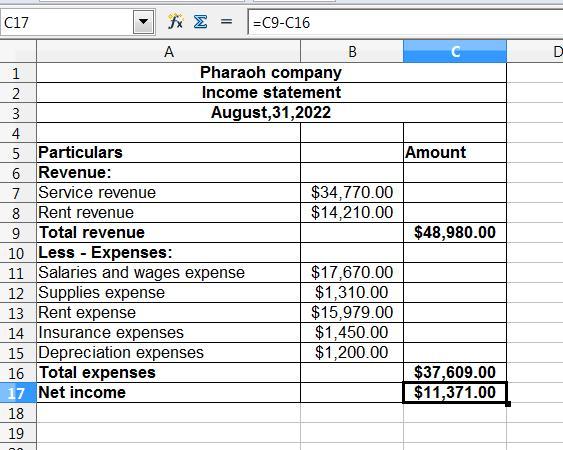 fter Adjustment Dr. Cr. Dr. Cr. Cash $11,540 $11,540 Accounts Receivable 8,570 9,220 Supplies 2,500 1,190 Prepaid Insurance 4,270 2,820 Equipment 16,840 16,840 Accumulated Depreciation—Equipment $3,789 $4,989 Accounts Payable 5,460 5,460 Salaries and Wages Payable 0 1,440 Unearned Rent Revenue 1,870 1,020 Common Stock 14,260 14,260 Retained Earnings 5,570 5,570 Dividends 2,500 2,500 Service Revenue 34,120 34,770 Rent Revenue 13,360 14,210 Salaries and Wages Expense 16,230 17,670 Supplies Expense 0 1,310 Rent Expense 15,979 15,979 Insurance Expense 0 1,450 Depreciation Expense 0 1,200 $78,429 $78,429 $81,719 $81,719 Prepare the income statement for the year ended August 31.