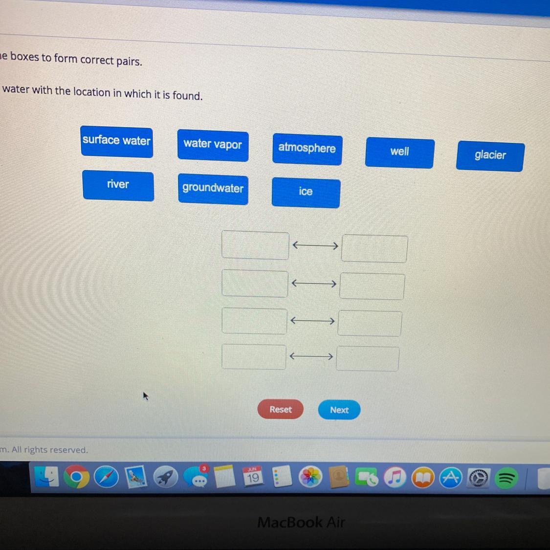 The correct answers are water vapor- atmosphere; surface water -river; ice- glacier; and groundwater -well