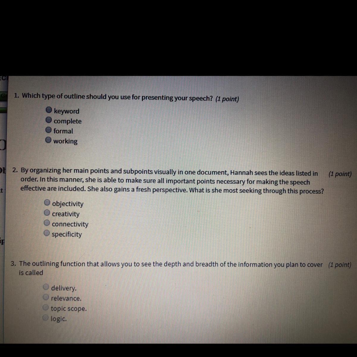 A formal outline is when you organize all the information you have gathered for said speech, it helps present a theme and the points of you speech (Even minor points.).