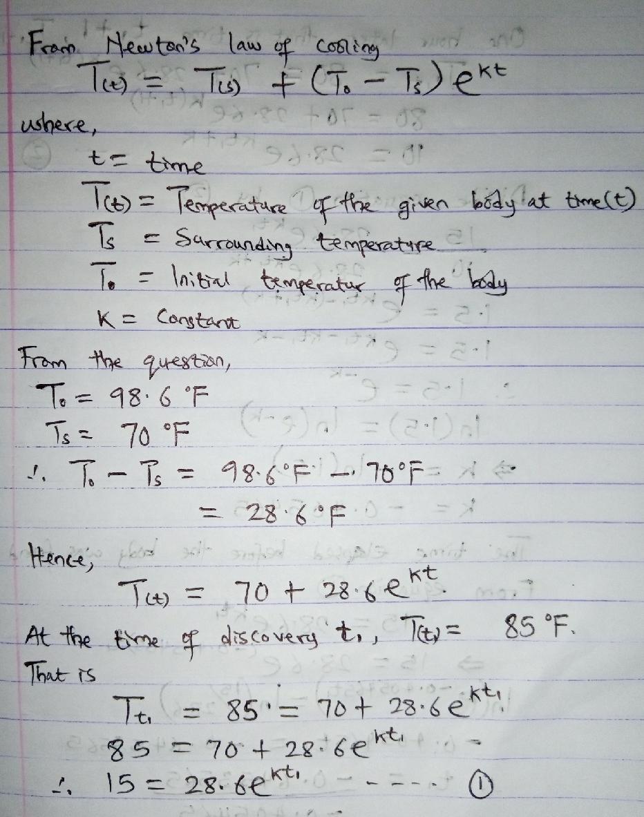 A dead body was found within a closed room of a house where the temperature was a constant 70∘F. At the time of discovery t 1