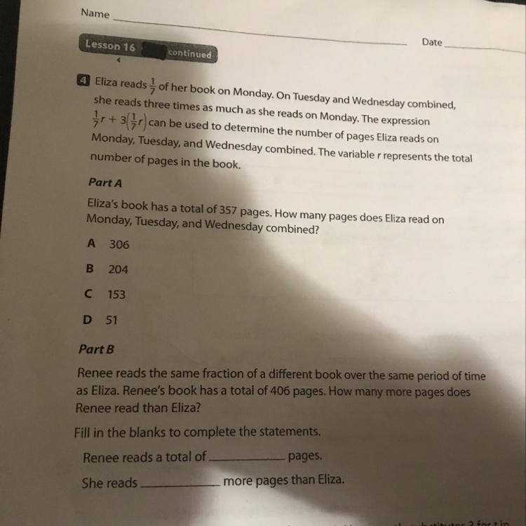 Part B: If Renee Reads the same fraction of a different book over the same period of time as Eliza, then if Renee's book has a total of 406 pages then combining Monday, Tuesday and Wednesday she reads a total of