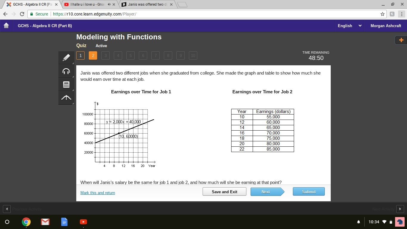 Janis was offered two different jobs when she graduated from college. She made the graph and table to show how much she would ea