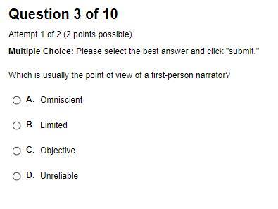 First person limited is when a story is told through the eyes of the narrator. The narrator, then, uses "I" to identify himself throughout the story. ... It makes the point of view limited because the story can only be told based on what the narrator knows.
