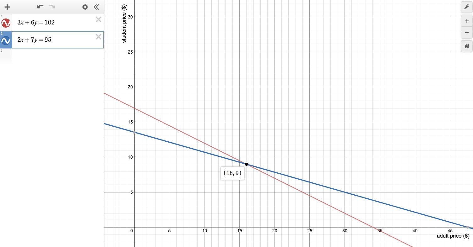 3a +6s = 102 . . . . . . where a = the adult ticket price, s = student price