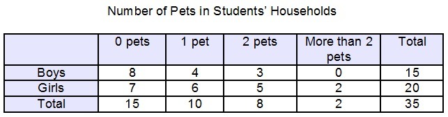 Janie asked all of her classmates about the number of pets they have in their household. Her findings are shown in the table.