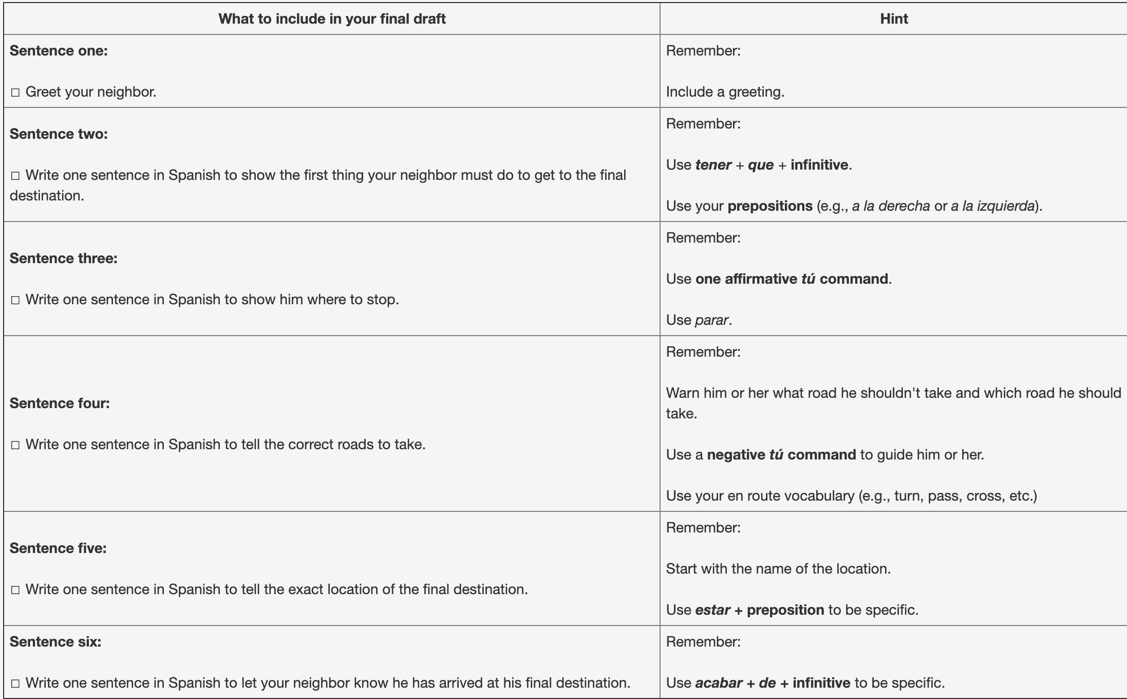2.) Para llegar a su destino, (then write here what directions your neighbor should take) for ex: gire a la derecha y siga recto (take a right and keep going straight)