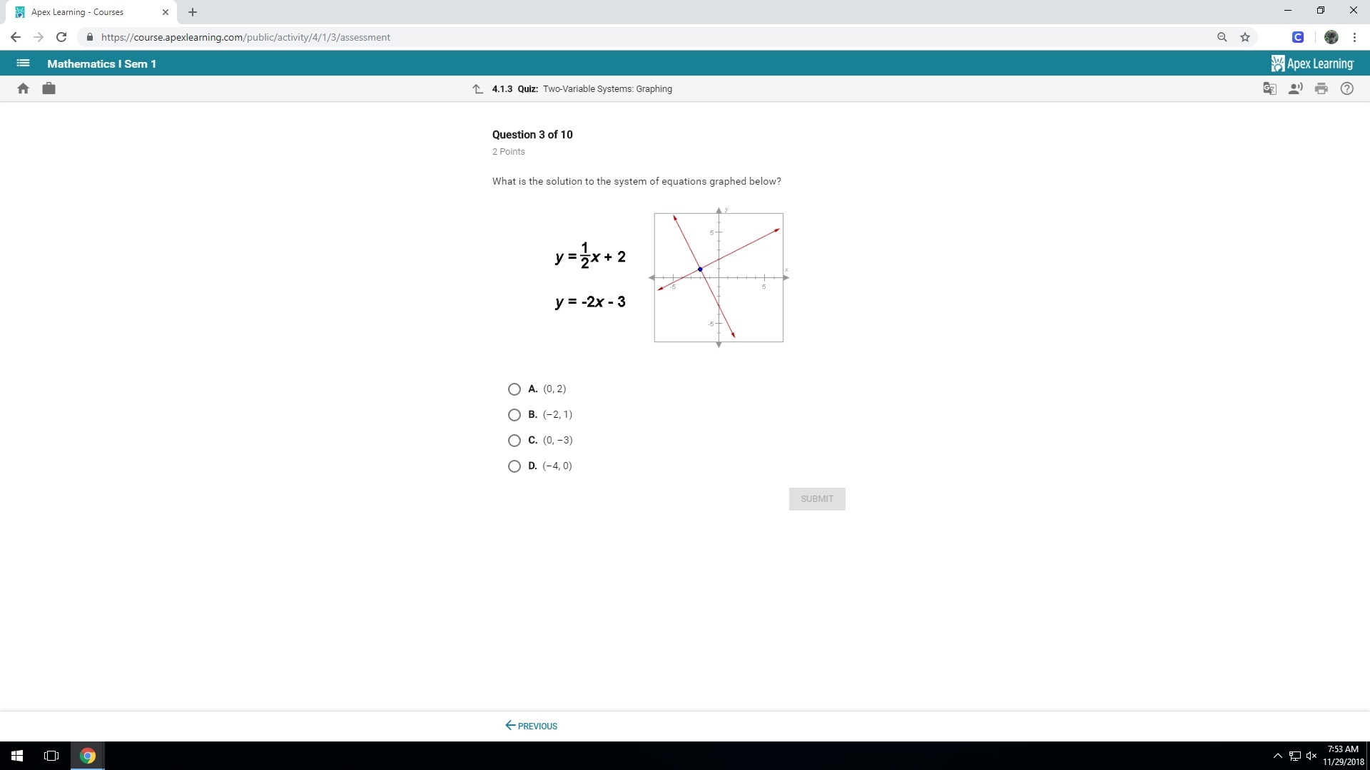 First off, the solution is where the graphs intersect. You can find this by setting the equations equal to each other. 0.5 x + 2 = -2x -3. Solve this to get 2.5 x = -5. This equal x = -2. Plug in the x value into either of the two equations to get a y value of 1. Thus, the answer would be (-2, 1). B! Hope this helps! :)