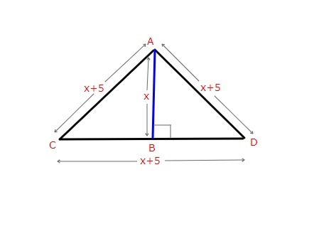 ![AB^2+BD^2= AD^2\\ \\ x^2+[\frac{1}{2}(x+5)]^2= (x+5)^2\\ \\ x^2+ \frac{1}{4}(x+5)^2 = (x+5)^2\\ \\ 4x^2+(x+5)^2= 4(x+5)^2\\ \\ 4x^2= 3(x+5)^2\\ \\ 4x^2=3(x^2+10x+25)\\ \\ 4x^2-3x^2-30x-75=0\\ \\ x^2-30x-75=0](https://tex.z-dn.net/?f=AB%5E2%2BBD%5E2%3D%20AD%5E2%5C%5C%20%5C%5C%20x%5E2%2B%5B%5Cfrac%7B1%7D%7B2%7D%28x%2B5%29%5D%5E2%3D%20%28x%2B5%29%5E2%5C%5C%20%5C%5C%20x%5E2%2B%20%5Cfrac%7B1%7D%7B4%7D%28x%2B5%29%5E2%20%3D%20%28x%2B5%29%5E2%5C%5C%20%5C%5C%204x%5E2%2B%28x%2B5%29%5E2%3D%204%28x%2B5%29%5E2%5C%5C%20%5C%5C%204x%5E2%3D%203%28x%2B5%29%5E2%5C%5C%20%5C%5C%204x%5E2%3D3%28x%5E2%2B10x%2B25%29%5C%5C%20%5C%5C%204x%5E2-3x%5E2-30x-75%3D0%5C%5C%20%5C%5C%20x%5E2-30x-75%3D0)