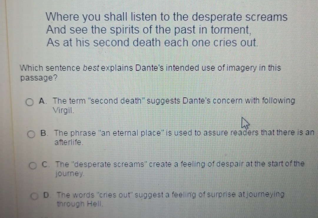 The sentence that best explains Dante's intended use of imagery is C. The "desperate screams" create a feeling of despair at the start of the journey. Usually an image is a detail that appeals to the senses of the audience. Images are not only visual; they can also be related to taste, sound, hearing or touch, and they transmit emotions or feelings to the reader. In this case, the phrase "desperate screams" appeals to the sense of hearing, and the audience can relate the desperation of this sound to the feeling of despair.
