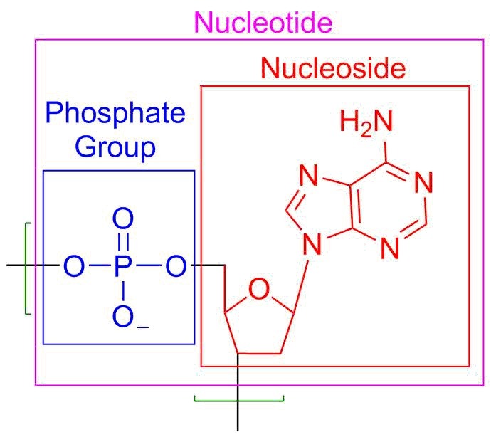 1) Nucleoside: Which is made up of 5-carbon sugar and a <span>nitrogenous base. Colored in RED.