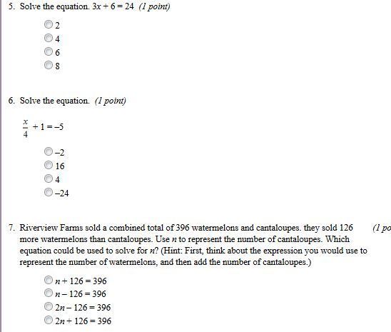 So for the first question, ( 3x + 6 = 24) just subtract 6 from both sides. Now we have ( 3x = 18). Now we just need to simplify it and divide both sides to find what x equals. Divide by 3 and we get X = 6 Second question is similar except we need to multiply every single number there by 4 to make x not a fraction. So now we have (X + 4 = -20) Just like last time, we're gonna subtact 4 from both sides. That leaves us with X = -24 3rd question. This one was a little more difficult for me. So we know that they sold 396 watermelons and cantaloupes and that they sold 126 more watermelons than they did cantaloupes. This does NOT mean that they sold 126 watermelons. It just means that they sold 126 MORE. So the correct formula for that question would be the last one, (2n + 126 = 396) To actually find out we would use that formula and subtract 126 from both sides and that leaves us with (2n = 200). Divide both sides by 2 and we find out that they sold 100 cantaloupes. Now don't forget that they sold 126 MORE watermelons than they did cantaloupes so we need to add 126 to 100. So they sold 126 watermelons and 100 cantaloupes. I hope that helps! I tried to write it in a way that made as much sense as possible.